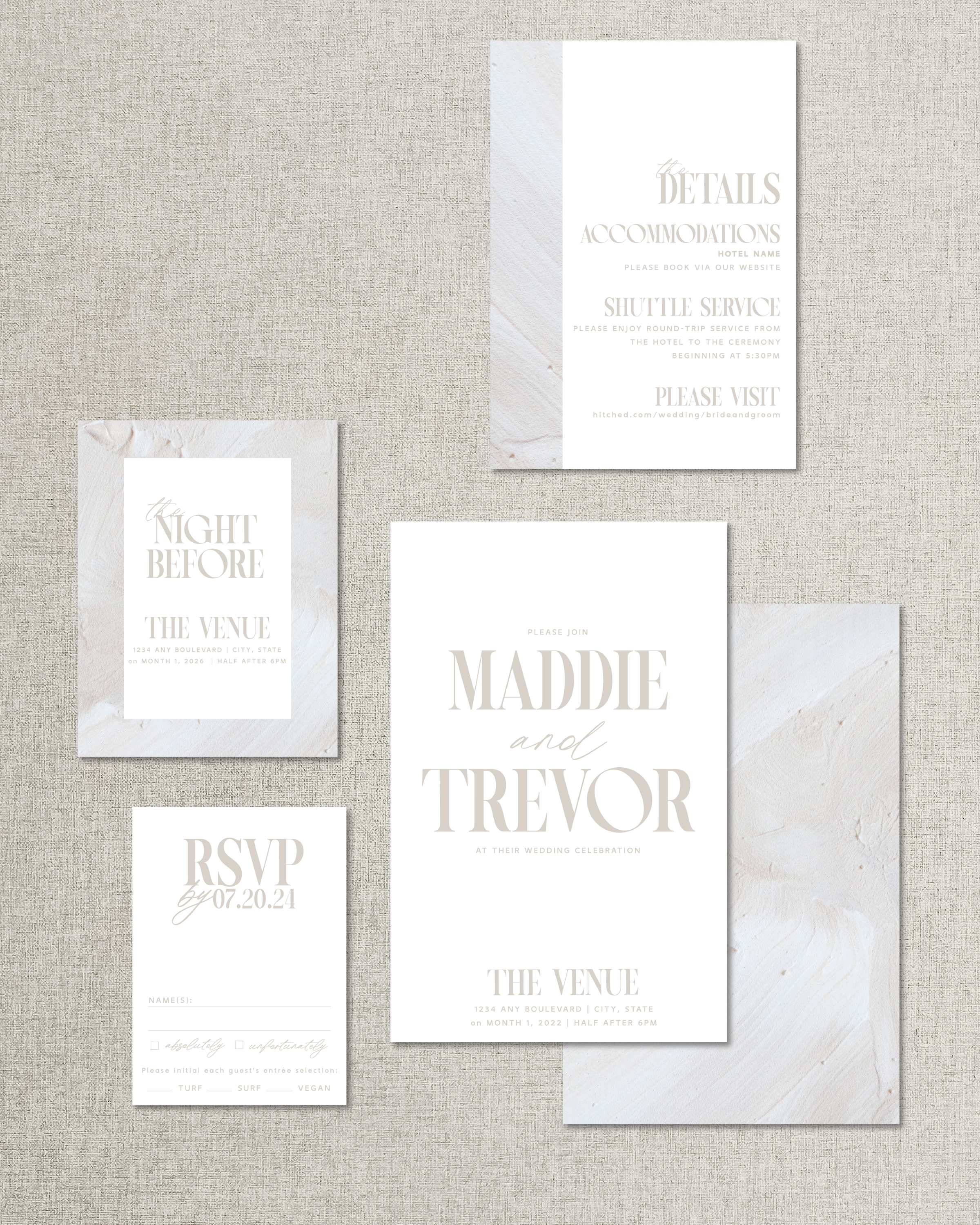 See and feel all the options for paper colors, weights and materials + samples of digital, letterpress, and foil printing. Includes a $50 coupon code to redeem on your RGS Wedding Stationery!